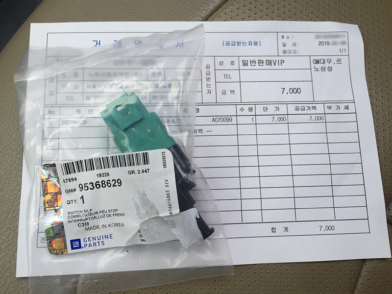 가격 7,000원 올뉴마티즈보다 최신의 몇개의 차종에서 사용되는 부품인듯, 색도 바뀌었다.