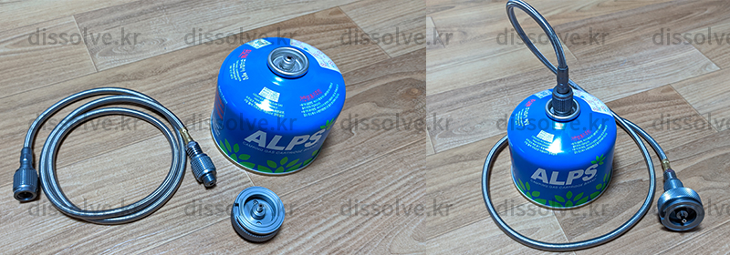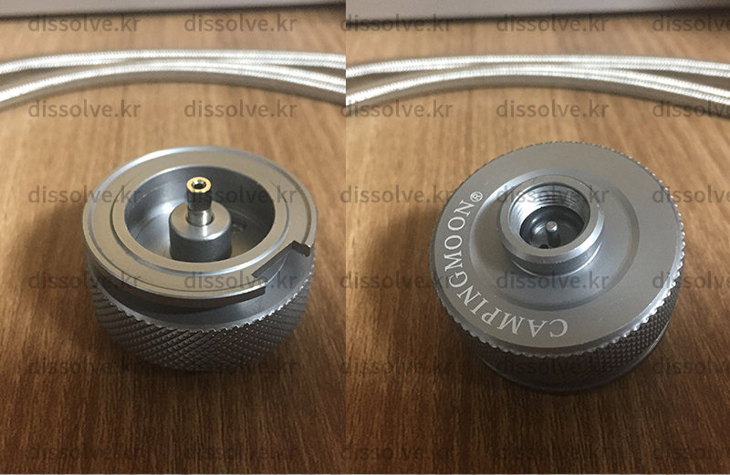 이런 어댑터가 있다. 이소부탄가스용기에 결합하면 출구가 막대부탄가스용기와 같게되어 해당 장비들에 결합해서 사용을 할 수 있게된다.