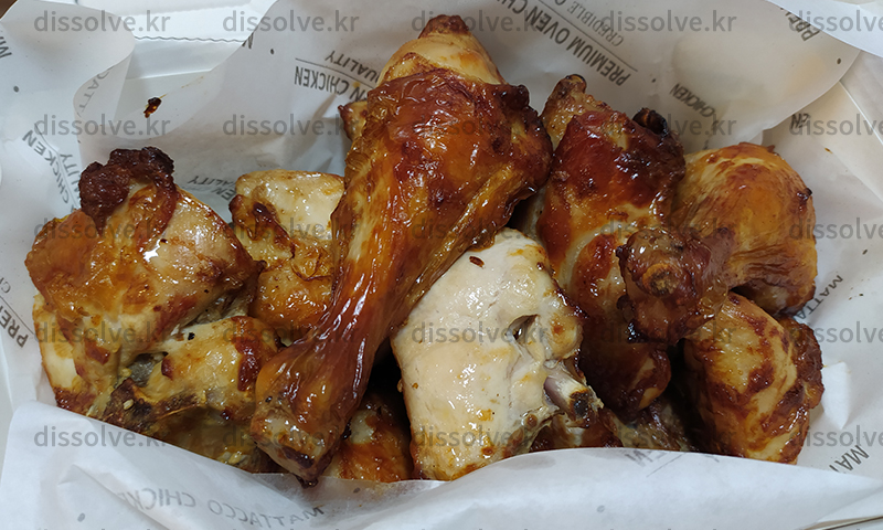 잘 구워진 닭이 들어있다. 껍질이 홀라당 벗겨져 있는 조각은 왜지 아쉬움~!