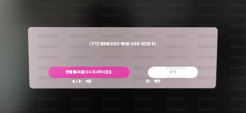 OSD는 LG색깔이다. 동봉된 케이블을 사용했는데 주의사항이 떡~ 하지 나타난다. ??