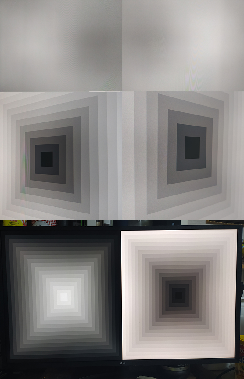 촬영한 카메라를 믿지 못한다 하더라도 회색에서 밝기가 균일하지 못하고 각도에 따라서 확연하게 차이가 난다. 눈으로 보면? 확실하게 보인다. 32인치 크기라 그닥 크지않지만 눈이 가운데 있다면 테두리 쪽으로 갈수록 색이 달라진다.