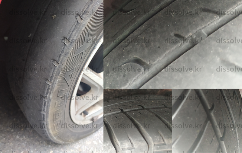타이어교체 전의 상태....왼쪽 사진이 오른쪽 앞바퀴였는데 앞쇼바등을 교체하고 편마보가 심해졌었다. 얼라이먼트를 안했다지만.... 비교적 장거리를 고속도로로 2번 했었는데 앞바퀴의 남은 마일리지를 다 썼었다. 뒷바퀴는 조금 남아있었지만 장마가 오기 전이 오월 중에 교체를 했다.