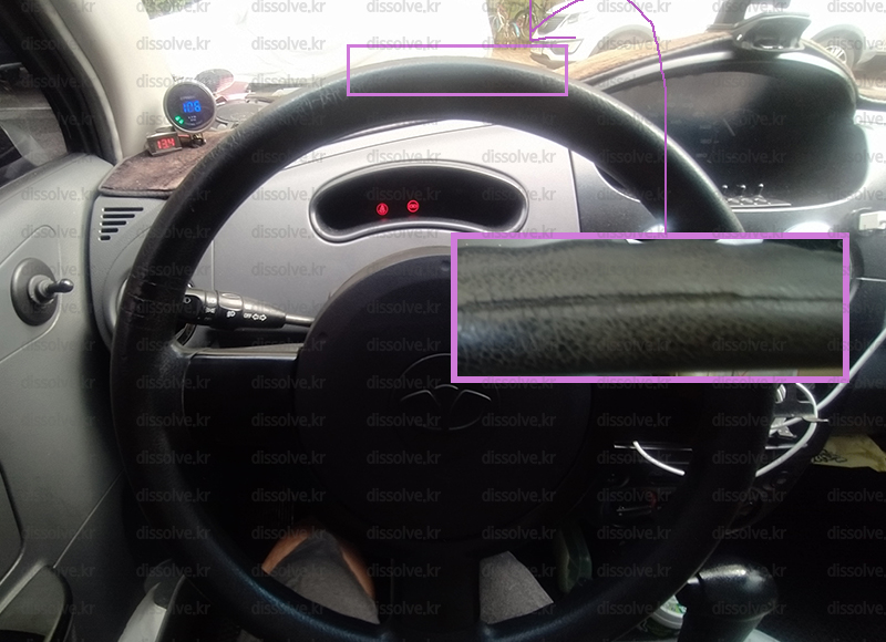 그러던 어느날 핸들의 상단부분에서 갈라진 게 손에 느껴졌었다. 운행을 전에 비해 하지 않고 때양볕에 세워놔서인지 노화가 빨리왔을 수도 있겠다. 지하주차장이 없는 관계로 진행은 점점 빨라질 수도 있는 것이고....