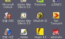 바탕화면의 단축 아이콘들이다. 돈으로 계산을 해보니 상당한 액수가 나온다. 얼른 돈 많이 벌어서 저것들을 다 돈주고 사서 써야하는데 ㅋㄷㅋㄷ... 저기 있는 것들 중에 가장 많이 누르는 아이콘은 "뽀샵CS" 디자이너도 아닌데 무지하게 누른다. "에펙6.5", "프리미어프로1.5" 도 많이 누른다. 베가스들은 많은 사람들이 사용을 한다기에 설치는 했는데 나랑은 안맞는 듯하다. "아드레날린"이랑 "사사미"는 영화를 볼 때 사용하고 가끔 "다잡아"랑 "이지클린"으로 컴퓨터를 검색해본다. ^^; "소렌손스퀴즈"랑 "캐논퍼스프로코더"는 동영상 포멧을 변환하는 건데...화질 잘나온다...^^; "오디션1.5"는 가끔 오됴를 짜르고 소리 조절하고...리저브 정도 넣을때 사용한다...그정도 밖에 사용할 줄 모르기에....